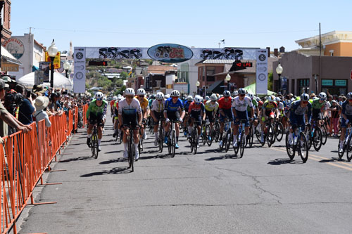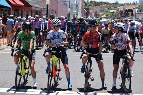 Race Leaders at the start for the UCI Women (L to R) Ellexi Snover, Best Sprinter; Sidney Swierenga, Best Young Rider; Lauren Stephens, Race Leader; Emma Langley, Queen of the Mountain