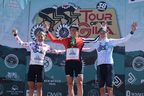 UCI Women Race Leaders after Stage 4 (L to R) Frankie Hall, accepting for injured Emma Langley, Queen of the Mountain; Lauren Stephens, Race Leader and Best Sprinter; Sidney Swierenga, Best Young Rider
