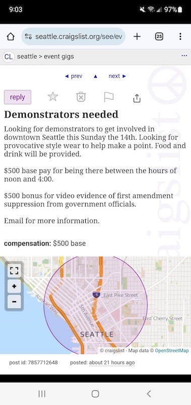 Reported image of a Craigslist ad inviting people to participate in a demonstration in Seattle, WA. on June 14, 2025. Money and food were promised to anyone attending.
