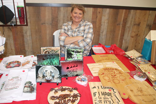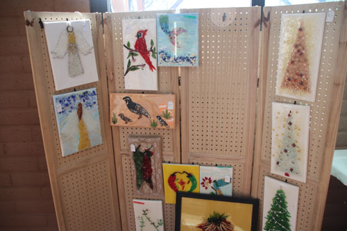 Carolyn Pearcy, Linda Brown and Rhonda Lackey with Carolyn's variety of works