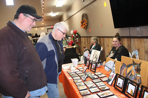 Justin Greenberg and Marilyn Alcorn looking at Abby Ogas art works