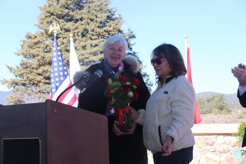 Mary Cowan, the head organizer of each year's WAA, receives flowers from committee member Gina Maestas