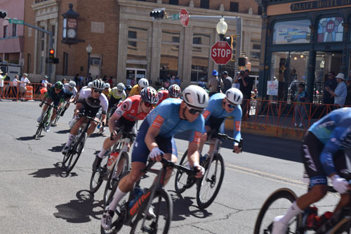 Race Leaders at the start for the UCI Women (L to R) Ellexi Snover, Best Sprinter; Sidney Swierenga, Best Young Rider; Lauren Stephens, Race Leader; Emma Langley, Queen of the Mountain